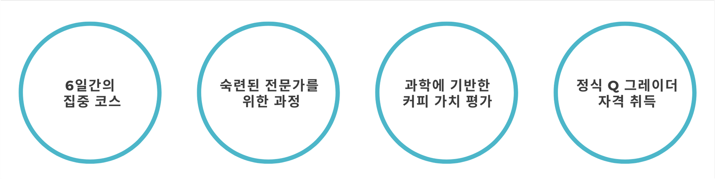 커리큘럼은 커피 전문가들이 실제로 커피를 평가하는 데 필요한 물리적(Physical), 묘사적(Descriptive), 정동적(Affective), 외재적(Extrinsic) 속성을 객관적으로 분석하는 역량을 기르도록 설계되어 있습니다. 프로그램을 성공적으로 이수한 수료자는 전 세계 커피 가치사슬에 걸쳐 탁월함의 상징으로 인정받는 Q 그레이더 자격을 획득하게 됩니다